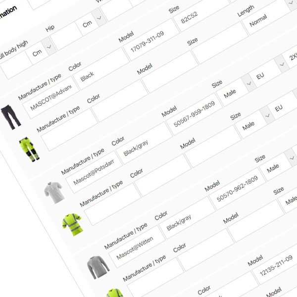 All relevant information can be registered here, such as trousers, jackets, T-shirts, sweatshirts, footwear, helmets, safety glasses, gloves, and more – everything an employee needs for their daily work.