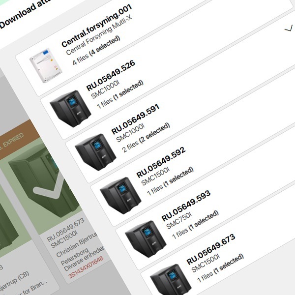 Users can select one or multiple pieces of equipment and download all associated documents in a compressed ZIP file.