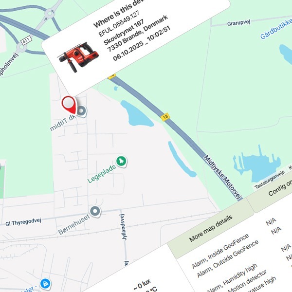 Using the GPS module, equipment can be tracked in real time through supported devices from Trackunit® and Trusted®.